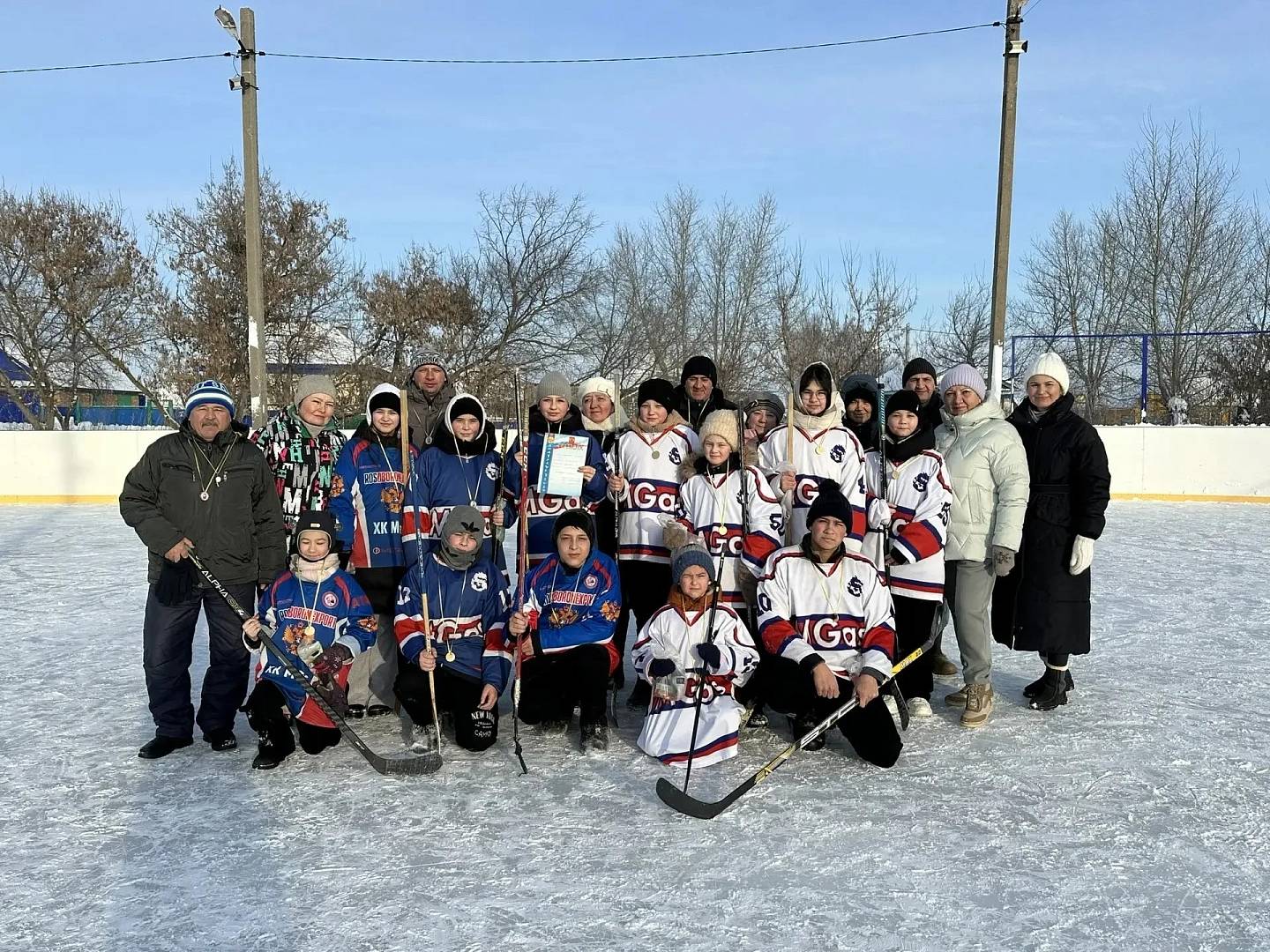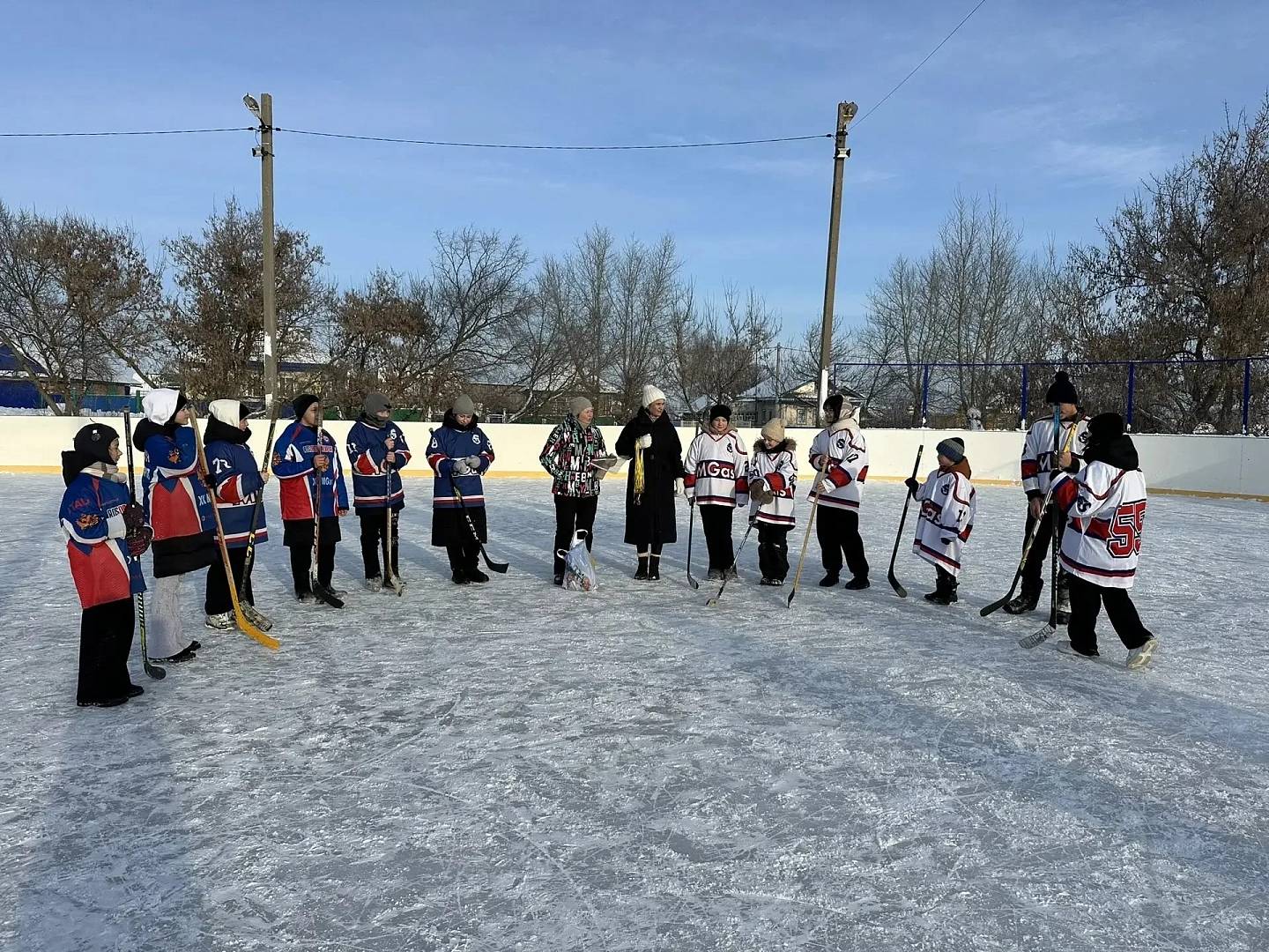 Сегодня, 7 января, ученики нашей школы на катке с. Верхний Аташ играли в хоккей на валенках. Разделившись на 2 смешанные команды "Голкипер" и "Енот", началась весёлая игра. Участники команд оживленно бегали за мячом.